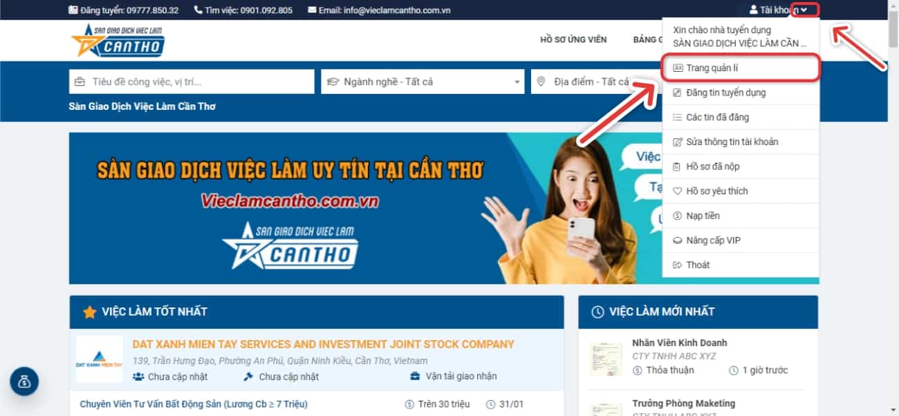 ở góc phải website vị trí "Tài khoản". Sau đó chọn "Trang quản lý"