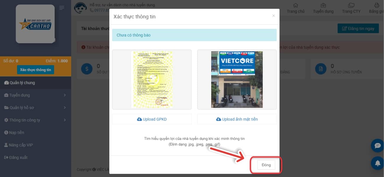 Sau khi đã tiến hành tải lên hoàn tất, nhà tuyển dụng chọn đóng cửa sổ.